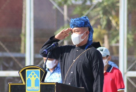 Kepala Pengamanan Lembaga Pemasyarakatan (KPLP) Cilegon, Zulkarnain yang menjadi Inspektur Upacara membacakan pidato Menteri Pendidikan dan Kebudayaan, Riset dan Teknologi Republik Indonesia, Nadiem Makarim.