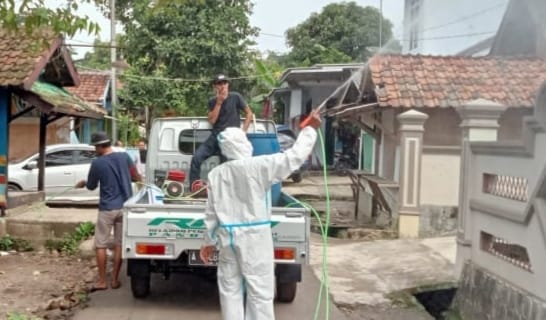 upaya untuk memutus mata rantai penyebaran Covid 19 saat ini sedang dilakukan penyemprotan disinfektan.