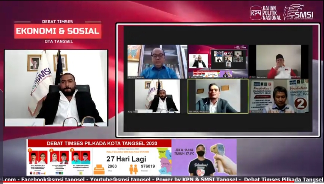 TANGERANG SELATAN- Menjelang Pemilihan Kepala Daerah Kota Tangerang Selatan (Tangsel) menghangat lantaran Veri Muhlis A. menyebut Paslon 02 dan 01 hanya menjadi follower dari program-program yang sudah dilakukan oleh Airin dan Benyamin sebelumnya, pada debat timses paslon yang diselenggarakan oleh SMSI Tangsel dan KPN melalui via virtual LIVE Youtube SMSI Tangsel dan akun Facebook SMSI Tangsel, Kamis (12/11/20) siang tadi.