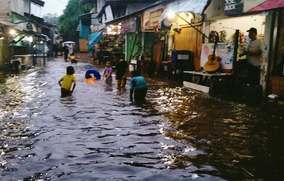 Jakarta – Permukiman di RT 11/04 Kelurahan Bangka Kemang, Mampang Prapatan, Jakarta Selatan, kembali dilanda banjir saat hujan deras sejak Sabtu (13/11/2021) sore.