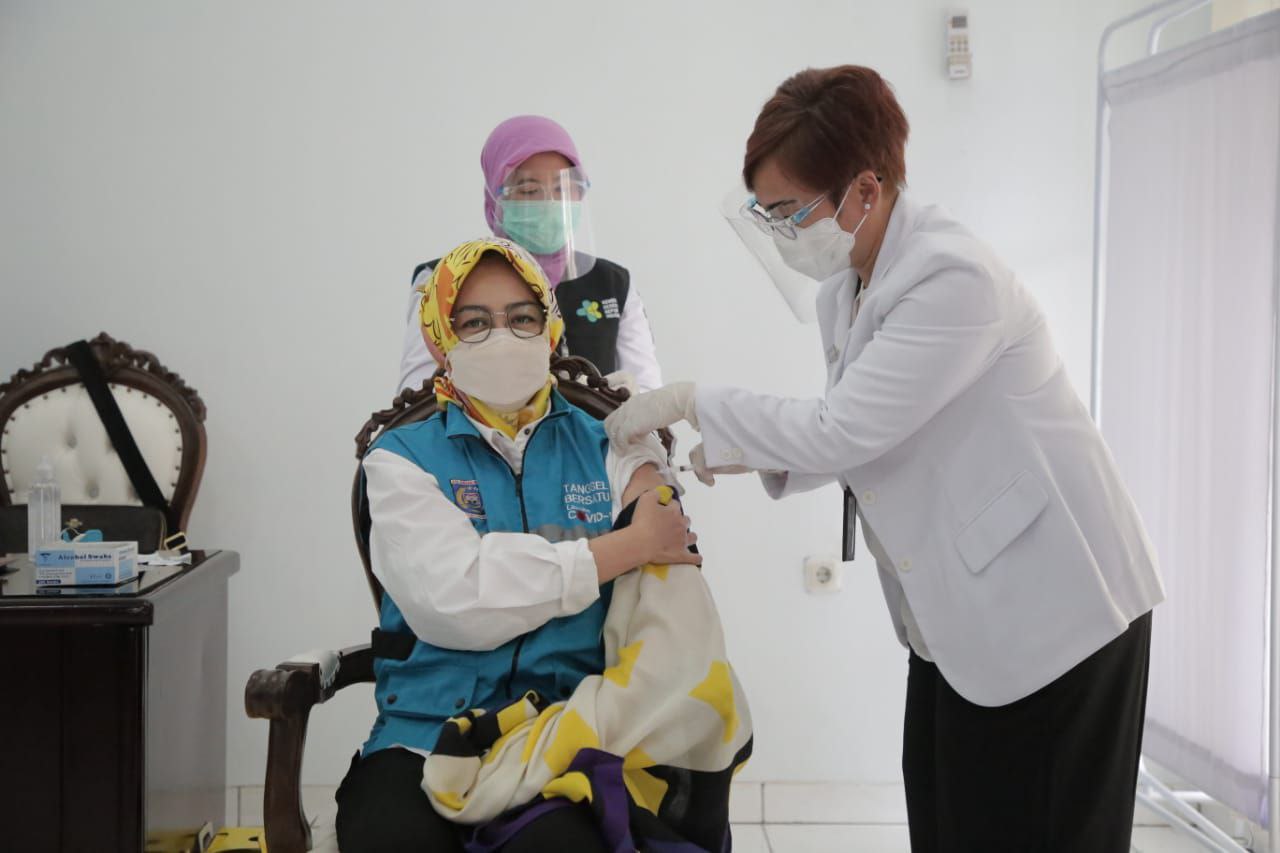 Siberindo.co – Wali Kota Tangerang Selatan Airin Rachmi Diany bersama dengan kepala daerah se-Banten dan unsur Forum Komunikasi Pimpinan Daerah (Forkopimda) melakukan vaksinasi Covid-19 di Pendopo Bupati Tangerang, Kota Tangerang, Kamis (14/1).