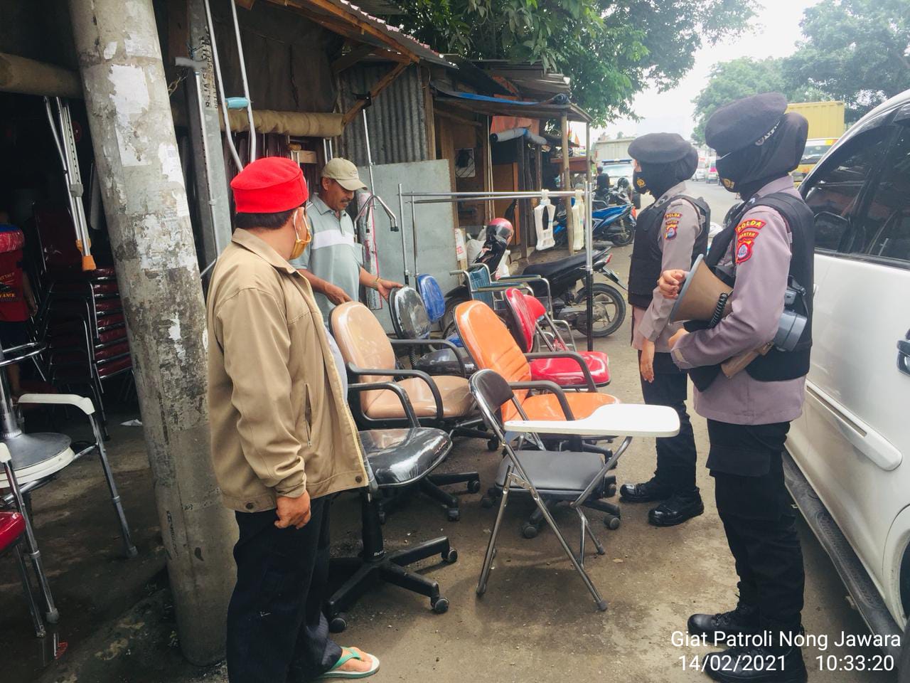 SERANG – Dalam rangka menekan penyebaran Covid-19 Patroli Nong Jawara Ditsamapta Polda Banten melaksanakan patroli dialogis yang dilakukan di Pasar Lama Serang, Minggu (14/02/2021)