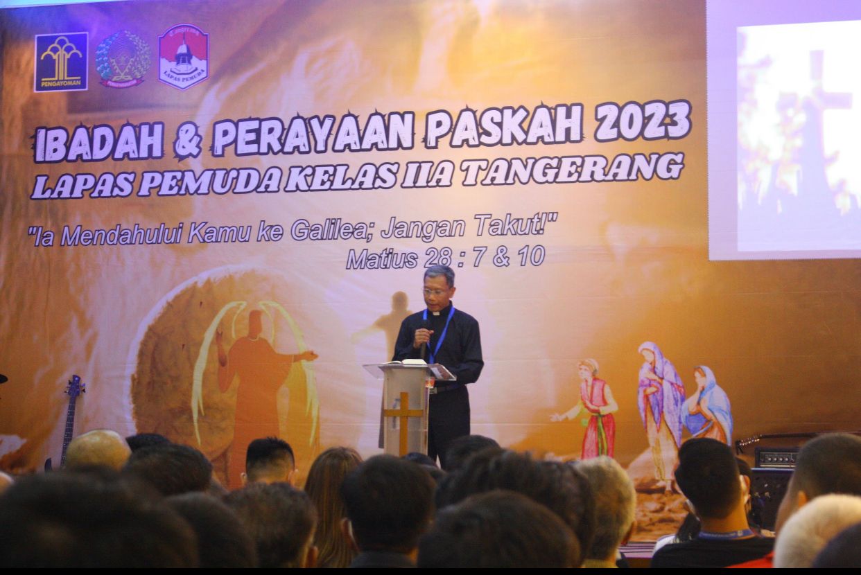 TANGERANG –Lapas Pemuda Kelas IIA Tangerang menggelar ibadah dan perayaan Paskah 2023 di Gereja Maranatha. Acara yang diselenggarakan mulai pukul 14.00 WIB ini mengambil tema “Ia Mendahului Kamu Ke Galilea; Jangan Takut!”.