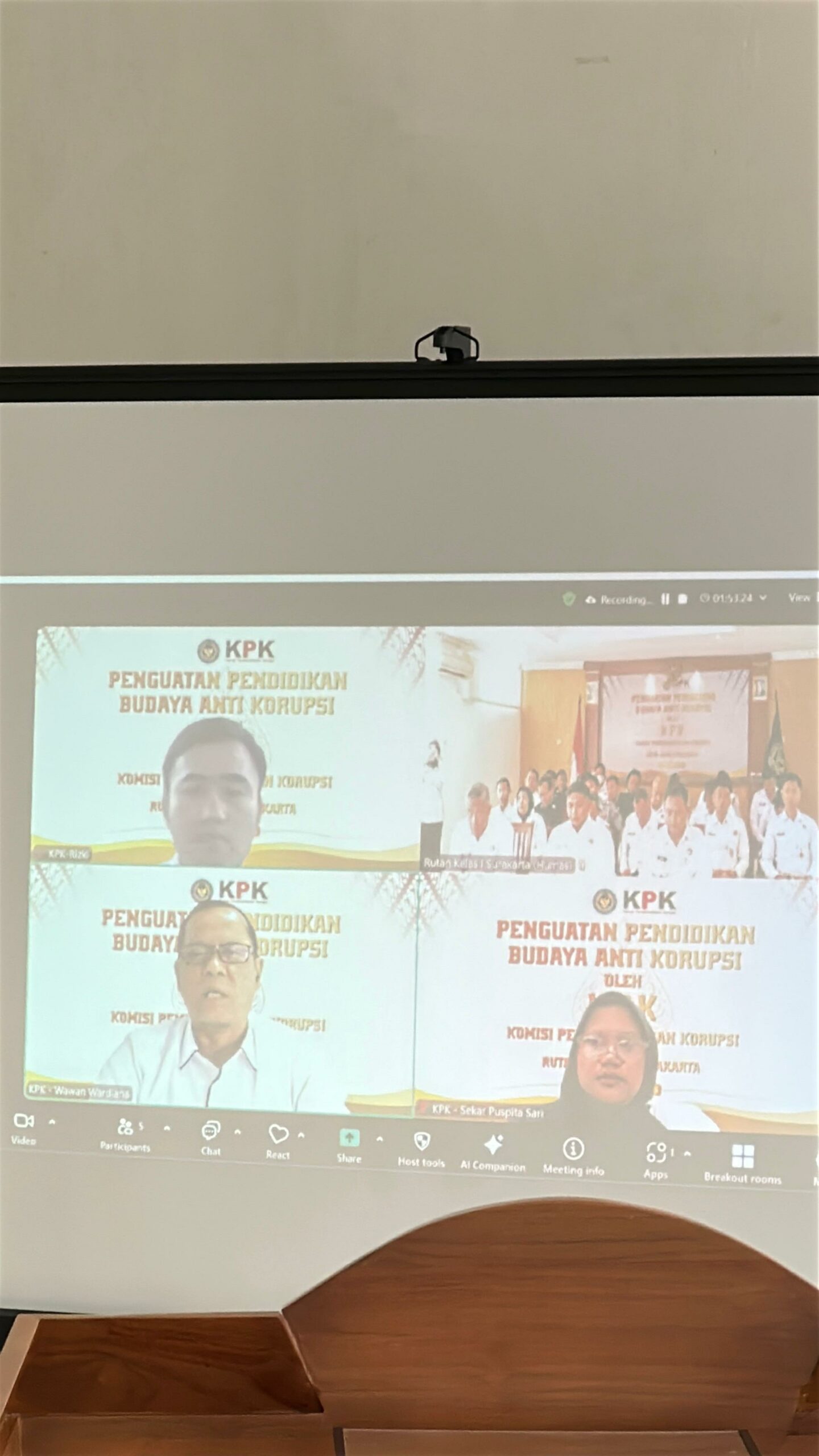 Surakarta – Pegawai Rutan Kelas I Surakarta Kantor Wilayah Direktorat Jenderal Pemasyarakatan Jawa Tengah mengikuti kegiatan Penguatan Budaya Anti Korupsi dengan bekerjasama dengan Komisi Pemberantasan Korupsi (KPK) secara daring melalui aplikasi Zoom, Rabu (14/05).