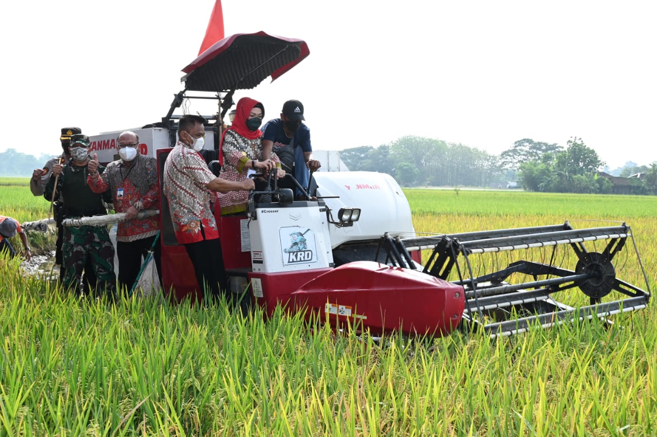 SUKOHARJO – Bupati Sukoharjo, Etik Suryani melakukan panen raya padi di Klaster Padi Modern Farming berlokasi di Desa Tangkisan, Tawangsari, Jumat (11/6/2021). Panen raya dimulai oleh Bupati Sukoharjo dengan menggunakan mesin panen combine harvester.