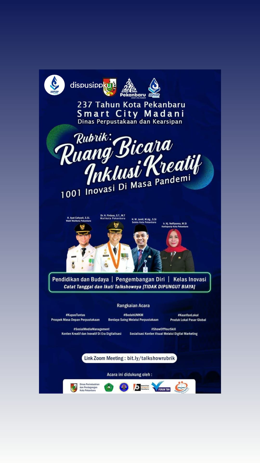 Serangkaian acara Rubrik: 1001 Inovasi Dimasa Pandemi digelar melalui live zoom meeting digelar dalam rangka meriahkan Hari Jadi Kota Pekanbaru ke 237 tahun 2021. Peserta dapat mengikuti acara secara gratis dan terbuka untuk umum.
