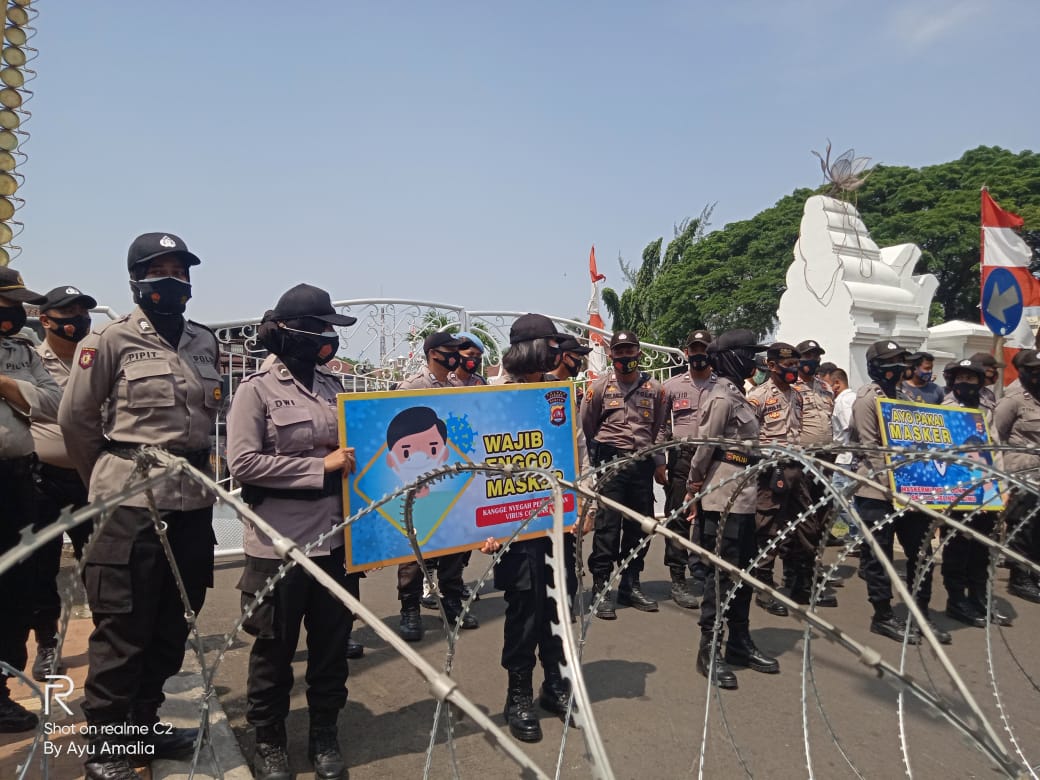 “Ya, kami dari Kepolisian tak hanya melakukan pengamanan jalannya aksi unjuk rasa, tapi para Polwan Polda Banten bersama Polres Serang Kota juga memberikan himbauan protokol kesehatan kepada massa aksi melalui papan himbauan,” ucap AKBP Yunus.