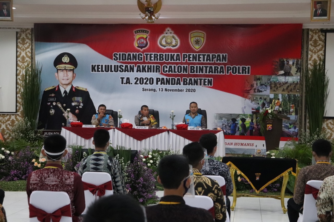 Kapolda Banten Irjen Pol Drs Fiandar Umumkan Kelulusan penerimaan Bintara Polri TA. 2020 dari 286 yang mendaftar dan Jumlah Casis Yang dinyatakan Lulus Terpilih yaitu 209 orang Polki 192 orang dan Polwan 17 orang yang terdiri dari Ba PTU 204 orang Polki 189 orang dan Polwan 15 Orang, Bakomsus Polki 2 orang, dan Ba Rekpro 3 orang Polki 1 orang dan Polwan 2 Orang.
