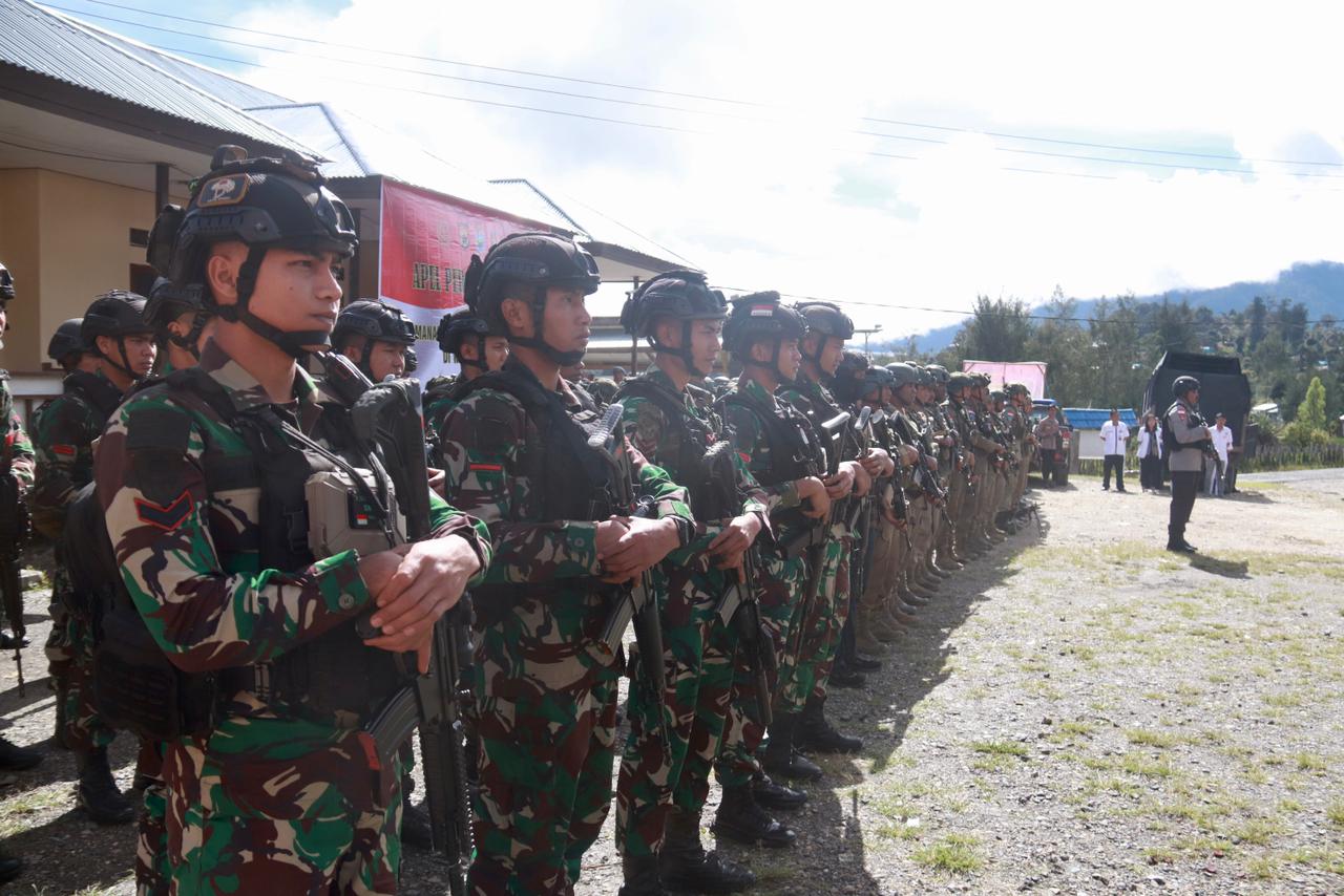 Intan Jaya – Satgas Pamtas Mobile Yonif 330 Tri Dharma bersama unsur Forkopimda Kabupaten Intan Jaya, Apkam TNI-Polri dan instansi terkait lainnya mengikuti Apel Pergeseran Pasukan Pengamanan Pemungutan Suara Pemilu 2024 di wilayah Intan Jaya yang dipimpin langsung oleh Kapolres Intan Jaya, AKBP Afrizal Asri bertempat di Mapolsek Intan Jaya, Selasa, (13/2/2024).