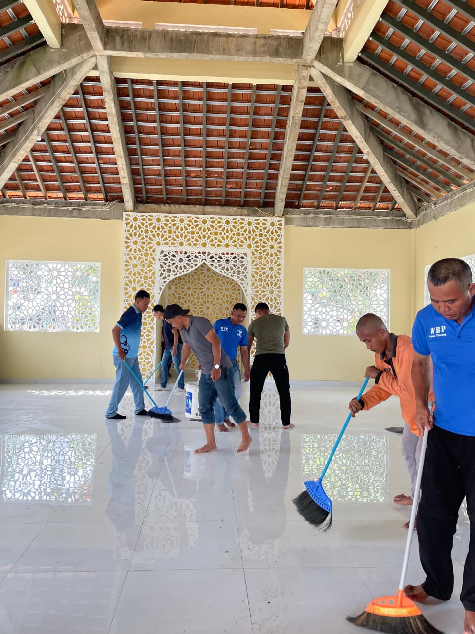 Plh. Kepala Kesatuan Pengamanan Lapas (Ka. KPLP) Surya Widjaya mengungkapkan bahwa para petugas dan warga binaan bergotong royong membersihkan area dalam dan luar masjid.