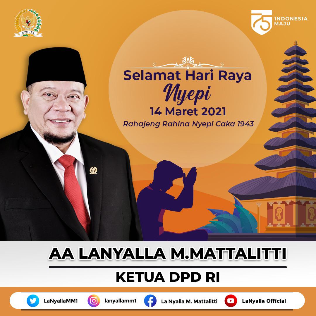 JAKARTA – Ketua DPD RI, AA LaNyalla Mahmud Mattalitti, berharap perayaan Hari Raya Nyepi bisa dijadikan momen untuk menemukan makna kehidupan. LaNyalla tak lupa menyampaikan selamat merayakan Hari Raya Nyepi kepada umat Hindu.