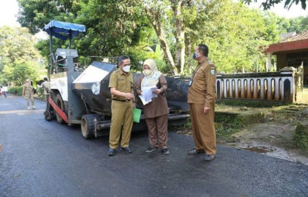 Bupati Pandeglang Irna Narulita didampingi Kepala Dinas PUPR Kabupaten Pandeglang, Asep Rahmat melakukan monitoring pembangunan jalan Montor Pagelaran, Senin (14/6/2021).