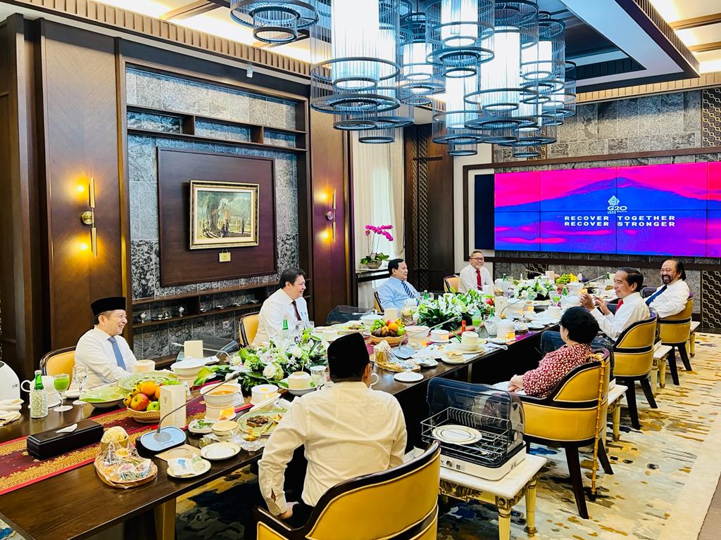 Pertemuan berlangsung hangat dan dalam suasana penuh keakraban. Presiden Jokowi dan para ketua umum parpol pun berbincang-bincang, diselingi tawa.