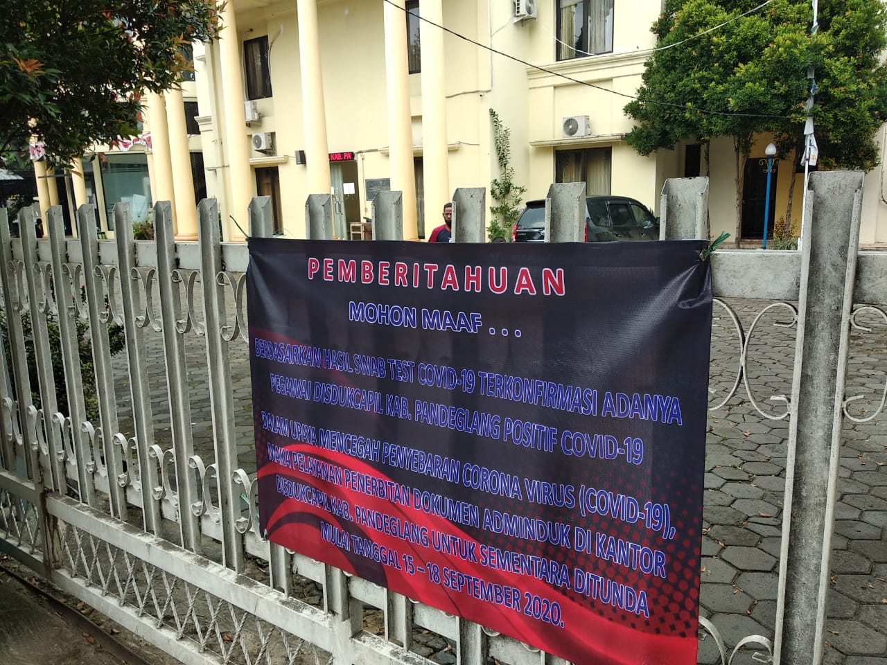 Pada pintu gerbang masuk Kantor Disdukcapil Pandeglang juga telah dipasang pamplet yang bertuliskan, “Pemberitahuan, mohon maaf berdasarkan hasil tes swab Covid-19 terkonfirmasi adanya pegawai Disdukcapil Pandeglang positif covid-19”.