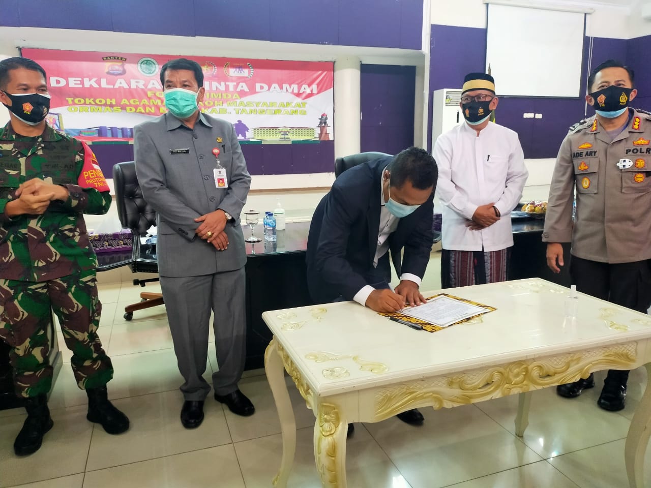 TANGERANG – Kapolresta Tangerang Kombes Pol H. Ade Ary Syam Indradi, S.H.,S.IK.,M.H memimpin kegiatan Deklarasi Cinta Damai Forkominda Tokoh Agama, Tokoh Masyarakat, Ormas, Etnis dan Komponen Masyarakat Kabupaten Tangerang, di Gedung Serba Guna (GSG) Komplek Perkantoran Pemerintahan Daerah Kabupaten Tangerang, Kamis (15/10/2020).