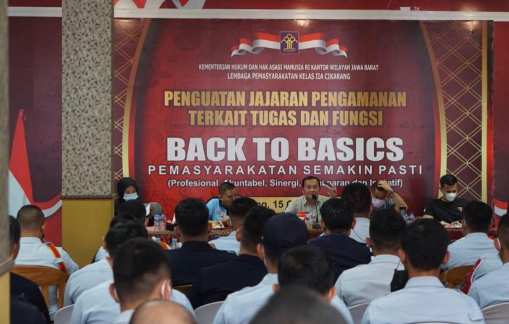 “Back To Basic” Pemasyarakatan kepada seluruh Jajaran Pengamanan, dipimpin langsung oleh Kepala Lapas Kelas IIA Cikarang SEG Johanes bersama Pejabat Struktural dibidang Keamanan yang berlangsung di Aula Gedung 1 Lapas Cikarang. Jumat (15/10/2021).