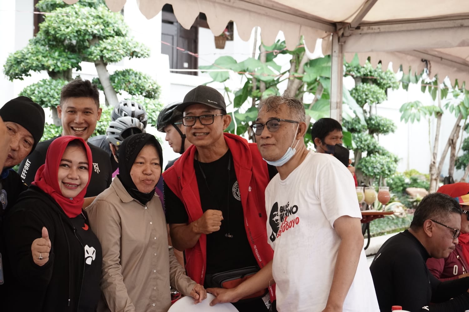 “Di garis finish kita ditunggu disini dengan pesta kerakyatan. Karena makannya nanti pakai rombong atau gerobak, semua makan dengan warga sekitar,” kata Eri sebelum gowes.