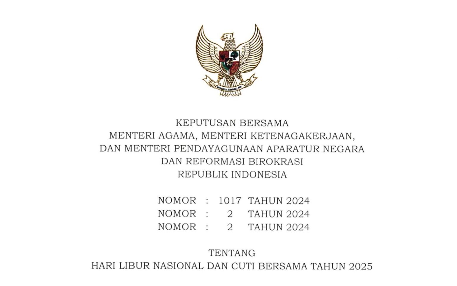 Penerbitan SKB Tiga Menteri ini dilakukan dalam rangka efisiensi dan efektivitas hari kerja serta memberi pedoman bagi instansi pemerintah dan swasta dalam melaksanakan hari libur nasional dan cuti bersama tahun 2025.