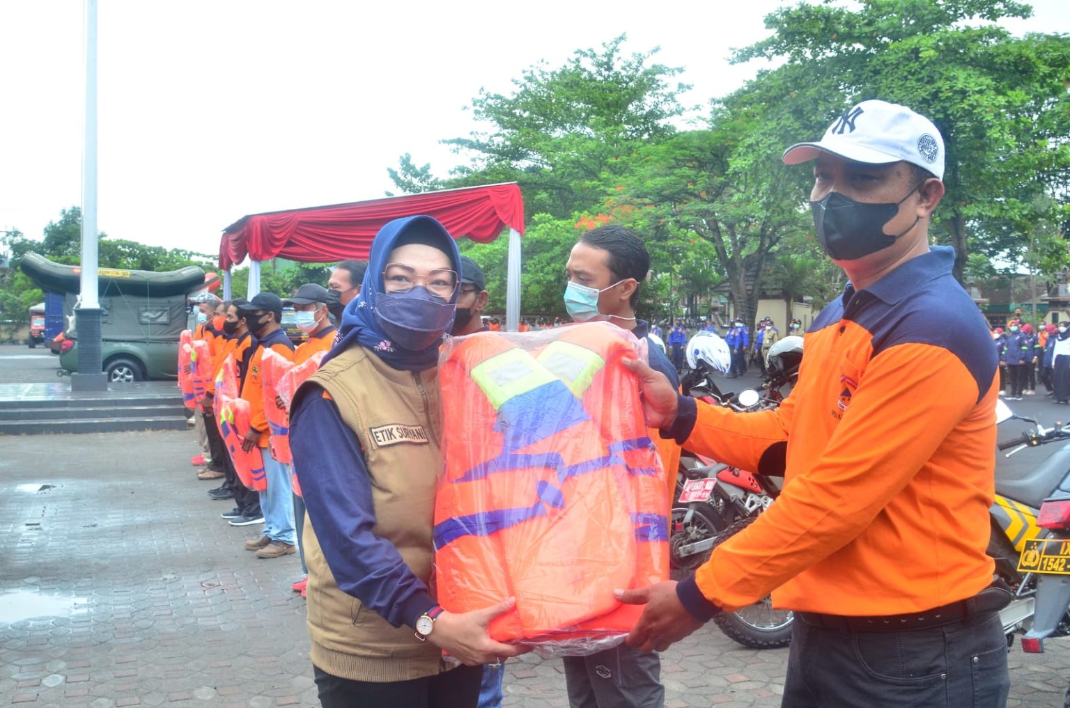 SUKOHARJO – Pemerintah Kabupaten Sukoharjo menyiagakan seluruh elemen untuk menghadapi kemungkinan terjadinya bencana di musim hujan. Untuk itu, seluruh personel, sarana prasarana termasuk perlengkapan dapur umum, dilibatkan dalam apel siaga bencana di halaman Pemkab Sukoharjo, Jumat (12/11/2021).