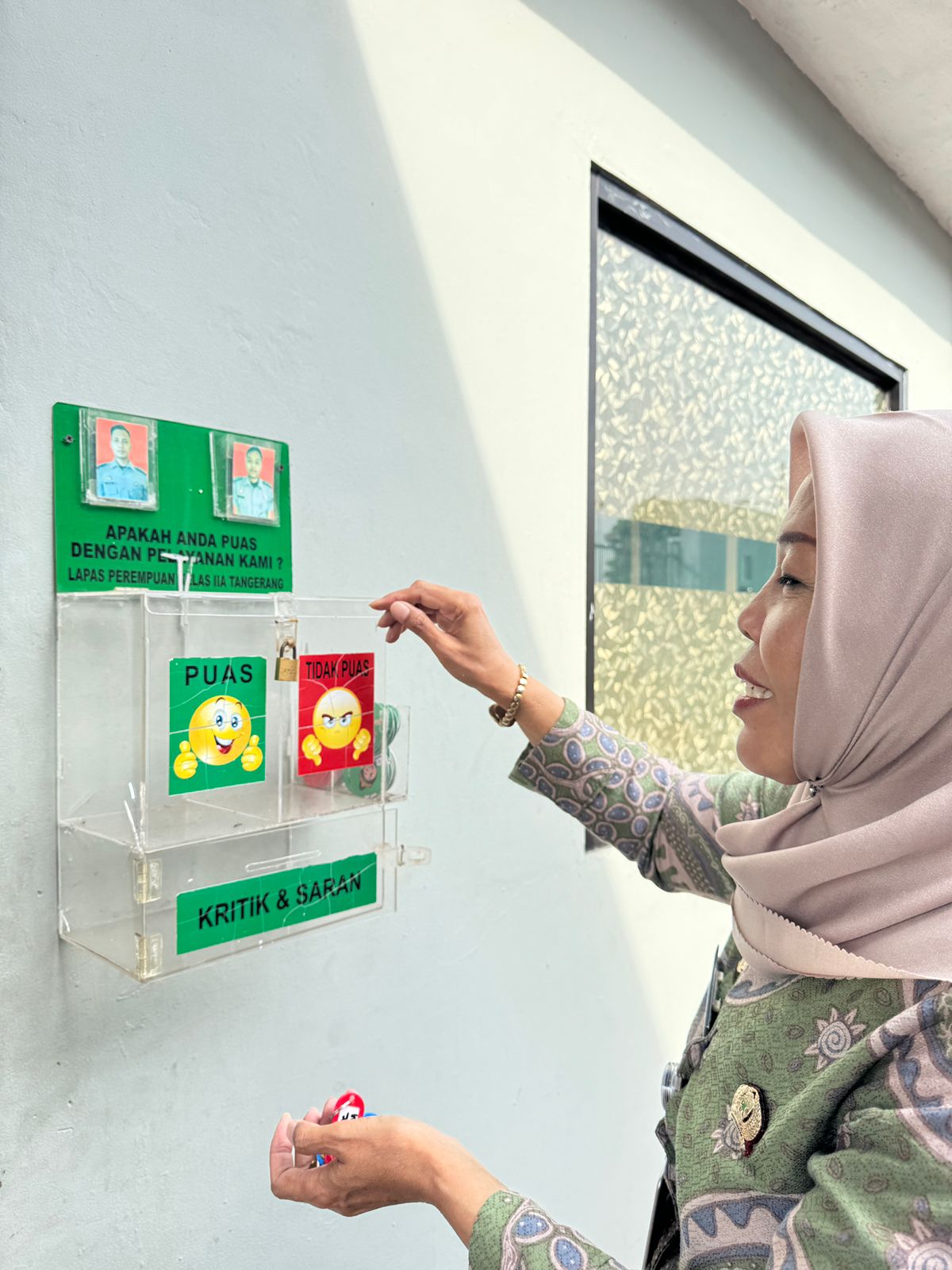 Tangerang, 15 November 2025 — Lapas Perempuan Kelas IIA Tangerang melaksanakan survei kepuasan layanan di area Pintu Utama (P2U) menggunakan mekanisme kartu penilaian yang dimasukkan ke dalam kotak survei oleh pengunjung.