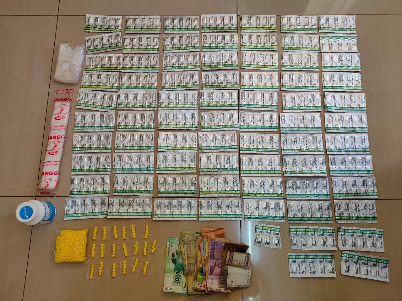 “Ya Kami dari Sat ResNarkoba Polres Lebak telah berhasil mengamankan sebanyak 1.850 butir obat tanpa izin edar yang terdiri dari 746 (butir) obat-obatan jenis Tramadol HCI, 1104 (butir) Obat-obatan warna kuning bertuliskan “mf” jenis Hexymer dan Uang tunai sebesar Rp. 215.000 yang berada didalam kamar tersangka EP warga Kp. Binglu RT/RW 007/002, Desa Sukaraja Kecamatan Malingping, Kabupaten Lebak,” kata AKP Ilman, Selasa (16/02/2021)