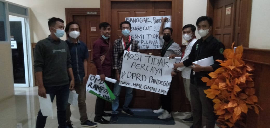 SIBERINDO.CO – Sejumlah Mahasiswa yang tergabung dari HMI,GMNI dan LMND Kabupaten Pandeglang nyatakan Mosi Tidak Percaya, di Depan Ruangan Badan Anggaran (Banggar) DPRD Kabupaten Pandeglang, Senin (15/03/2021).