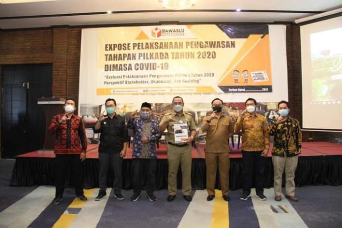 CILEGON – Walikota Cilegon, Helldy Agustian hadiri kegiatan ekspos pengawasan pelaksanaan Pilkada tahun 2020 di masa Covid-19 yang diselenggarakan Bawaslu Kota Cilegon.