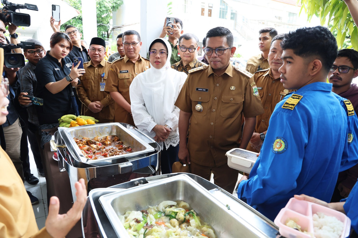 Gubernur Banten, Andra Soni meninjau uji coba Makan Bergizi Gratis (MBG) di SMK Negeri 1 Anyer, Kabupaten Serang. MBG di SMKN Anyer diselenggarakan Group Hotel Aston pada Selasa, (15/4/2025).