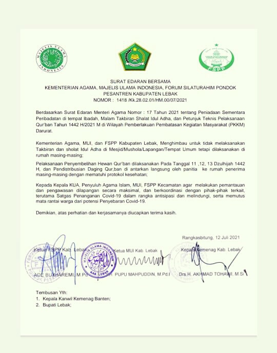 Hal ini tertuang dalam surat edaran Nomor 141B/kk.28.02 01/HM.00/07/2021 yang ditanda-tangani pimpinan tiga lembaga di Lebak terkait rencana pelaksanaan giat shalat Iedul Adha 1442 H untuk masyarakat muslim di Lebak, pada Tanggal 20 Juli mendatang, di Kabupaten Lebak.