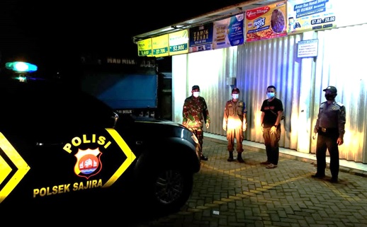 Giat Ops PPKM Darurat Covid-19 dipimpin langsung Kapolsek Sajira AKP Waluyo didampingi Aiptu Johan, Bripka Edi H,Bripka Candra MP dan Brigadir Casnuri SH serta dari Koramil Serka Darko dan dari Satpol-PP Umar.