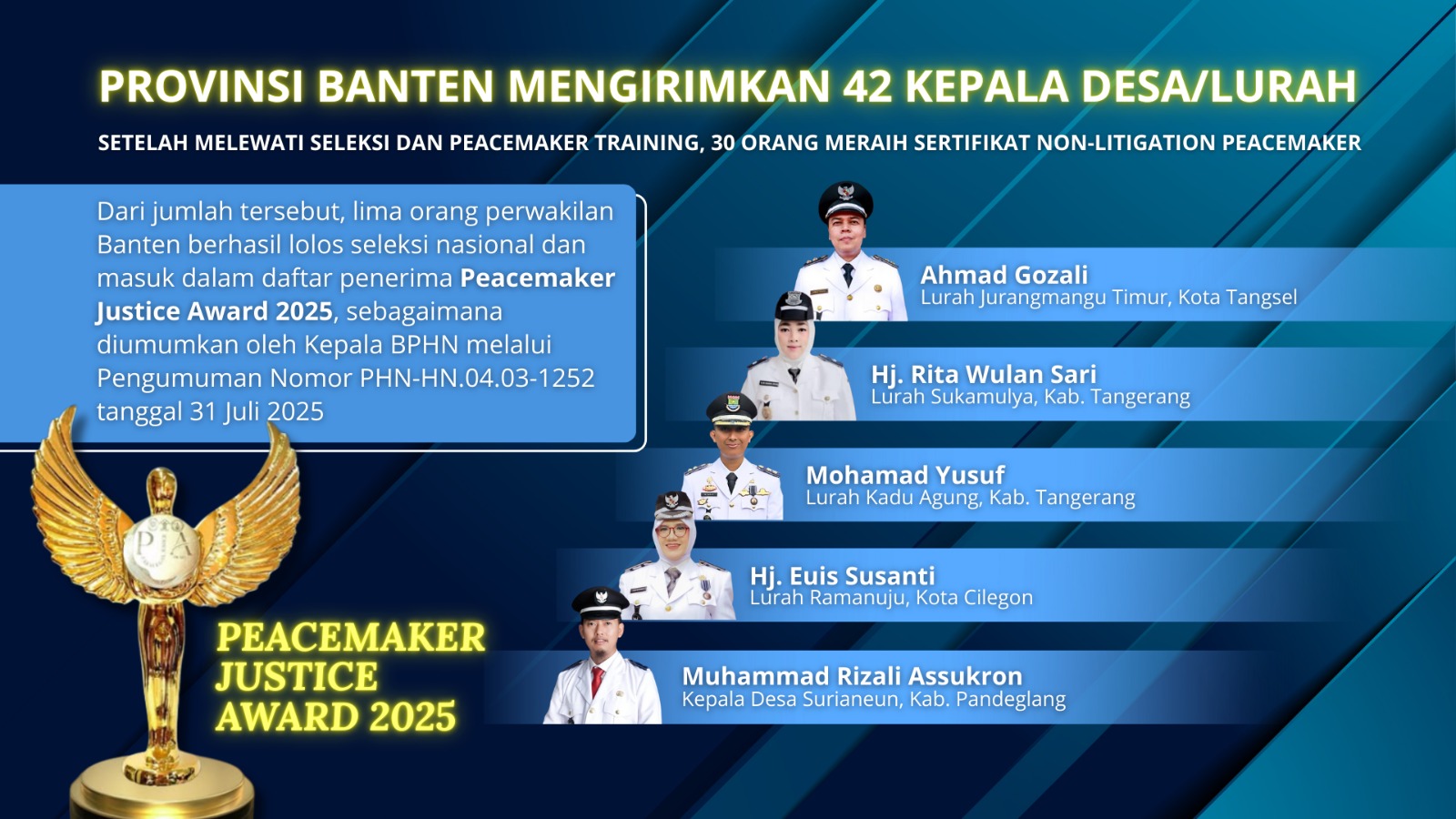 Pada tahun 2025, Provinsi Banten mengirimkan 42 Kepala Desa/Lurah sebagai peserta. Setelah melalui tahap seleksi dan Peacemaker Training, sebanyak 30 orang berhasil meraih sertifikat Non-Litigation Peacemaker (NLP). Dari jumlah tersebut, lima orang perwakilan Banten berhasil lolos seleksi nasional dan masuk dalam daftar penerima Peacemaker Justice Award 2025, sebagaimana diumumkan oleh Kepala BPHN melalui Pengumuman Nomor PHN-HN.04.03-1252 tanggal 31 Juli 2025