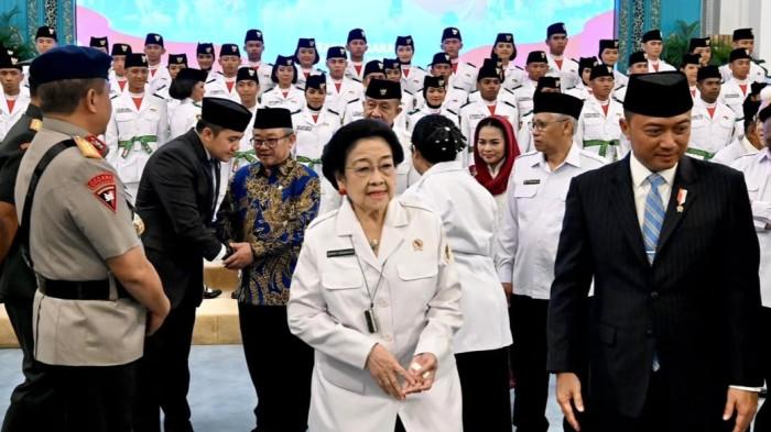 Presiden Ke-5 RI sekaligus Ketua Dewan Pembina Badan Pembinaan Ideologi Pancasila (BPIP) Megawati Soekarnoputri menghadiri Pengukuhan Paskibraka Nasional 2025 yang berlangsung di Istana Negara, Jakarta, Sabtu (16/8/2025).