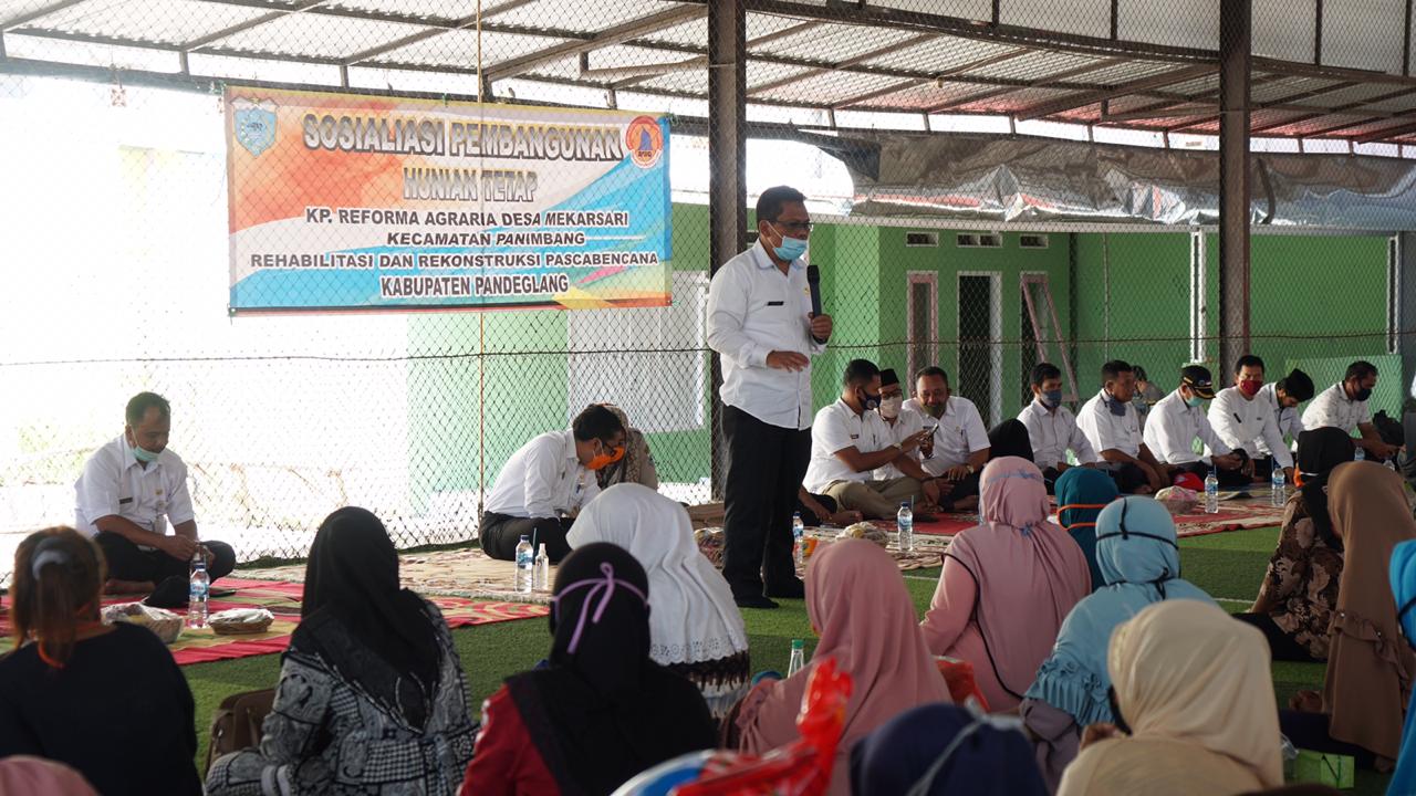 Pandeglang, Siberindo.co – Pembangunan Hunian Tetap (Huntap) bagi warga terdampak bencana Tsunami Tahun 2018 lalu di Kecamatan Panimbang, ditargetkan akan rampung pertengahan desember tahun ini. Hal tersebut disampaikan Ketua Pelaksana Badan Penanggulangan Bencana Daerah Kabupaten Pandeglang Surya Darmawan saat Sosialisasi Pembangunan Huntap di Kampung Reforma Agraria Desa Mekarsari Kecamatan Panimbang, kegiatan sosialisasi tersebut di laksanakan di lapangan Futsal Desa Panimbangjaya, Rabu (16/09).