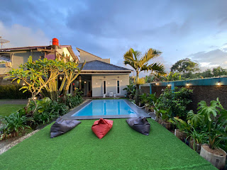 Salah satu fasilitas di halaman tempat penginapan yakni terdapat private pool dengan konsep ala Bali.