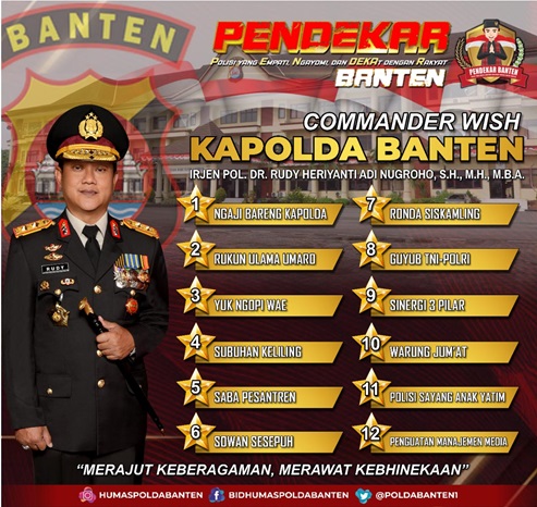 Diketahui, 12 program Commander Wish Kapolda Banten, pertama yaitu Ngaji Bareng Kapolda, kedua Rukun Ulama Umaro, ketiga Yuk ngopi wae, keempat Subuhan keliling, kelima Saba Pesantren, keenam Sowan Sesepuh, ke tujuh Ronda Siskamling, ke delapan Guyub TNI-Polri, kesembilan Sinergi 3 Pilar, sepuluh Warung Jum’at, sebelas Polisi sayang anak yatim, dan yang terakhir ke dua belas penguatan manajemen media. * (RLS/REDAKSI )