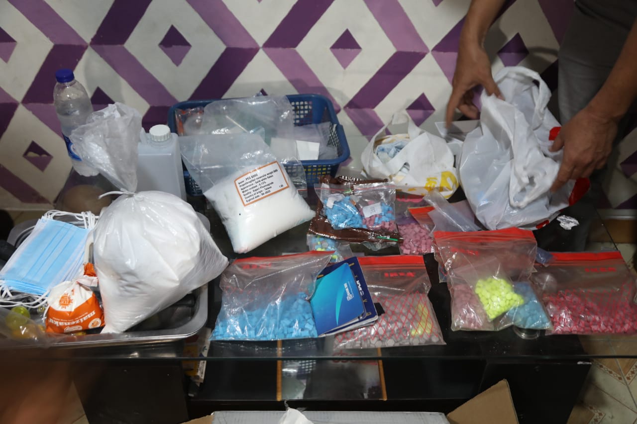 Lanjut Wahyu, “Personel menemukan 1850 butir saat melakukan penggeledahan di TKP. Dalam waktu yang sama, petugas juga menemukan 1 buah palu karet, 2 buah palu cetak, 1 buah timbangan, 4 set logo cetakan inex, 1 toples d-Basf (acetaminophen), Alat Pembuat (Prekursor) dan barang bukti lainnya.