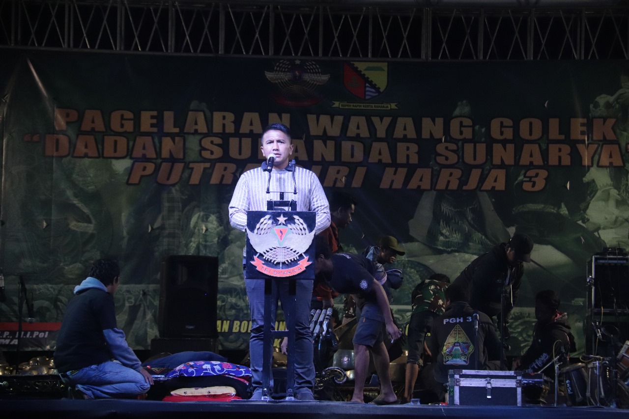 Pada pertunjukan seni hiburan tradisional Wayang Golek yang digelar dalam rangka peringatan HUT-72 Yonif 330 ini, Mayor Inf Riska Imron, Wadanyonif 330, yang mewakili Danyonif 330 untuk membuka acara dalam sambutannya mengucapkan terimakasih kepada kepada semua pihak yang telah berpartisipasi dan memberikan dukungan atas terselenggaranya Pagelaran Wayang Golek di Yonif 330. “Kami ucapkan terimakasih dan penghargaan setinggi-tingginya kepada semua pihak yang telah membantu terselenggaranya acara ini, khususnya kepada Pemkab Bandung dan Ki Dalang H. Dadan Sunandar Sunarya. Seni Sunda Wayang Golek bukan sekadar pertunjukan hiburan, setiap cerita yang dibawakan Sang Dalang mengandung tuntunan moral dan kebijaksanaan. Selamat menikmati,” ujarnya.