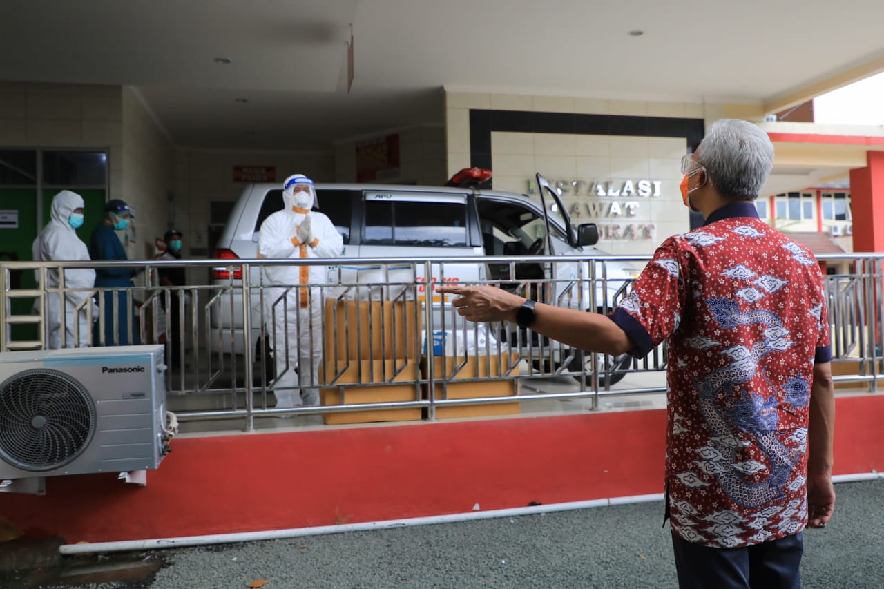 Gubernur juga sempat menyapa para tenaga kesehatan di IGD RSUD Wonogiri. Dia berpesan agar para nakes tetap ketat dalam SOP perawatan, sehingga tak tertular.