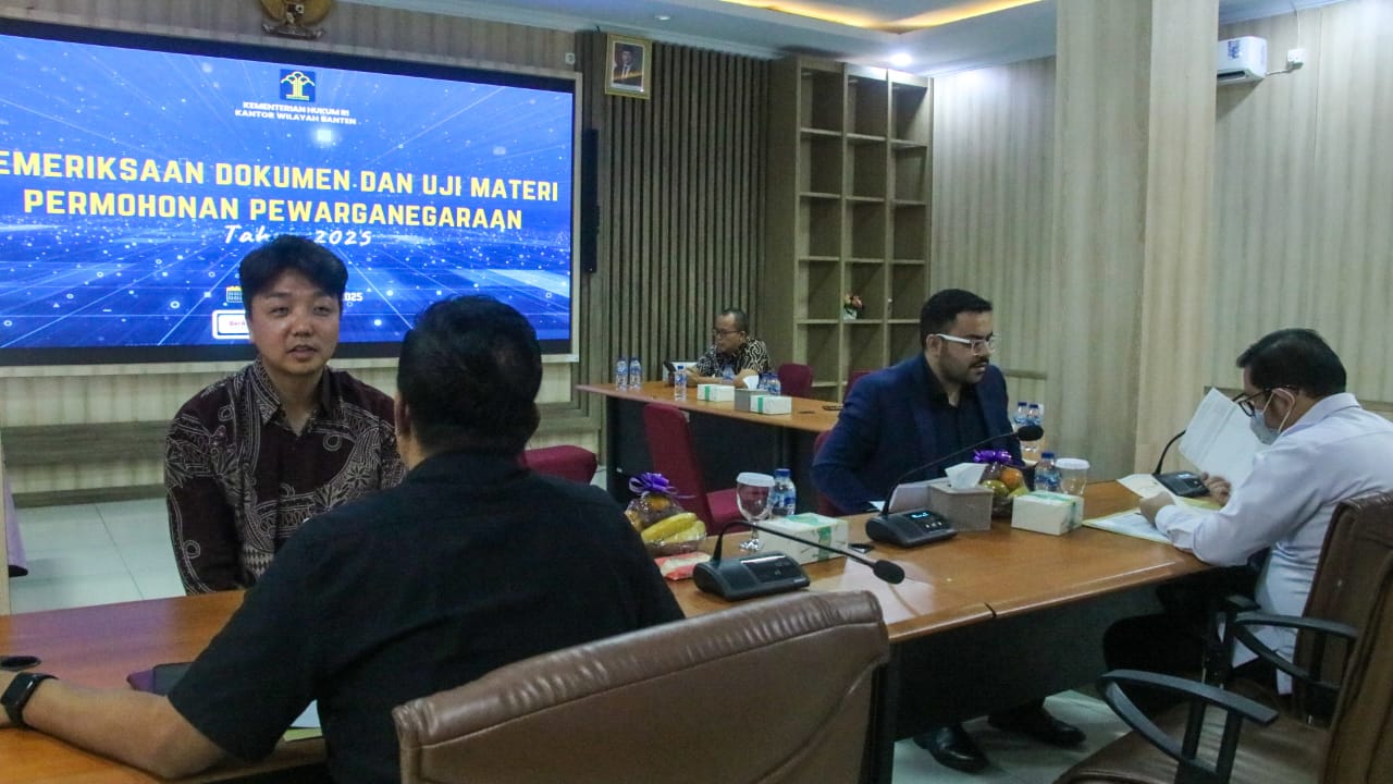 SERANG – Menjadi salah satu tahapan penting dalam dalam proses pengajuan permohonan pewarganegaraan sesuai dengan ketentuan Undang-Undang Nomor 12 Tahun 2006 tentang Kewarganegaraan Republik Indonesia, Kantor Wilayah Kementerian Hukum Banten melakukan wawancara permohonan pewarganegaraan, Kamis (17/07/2025).