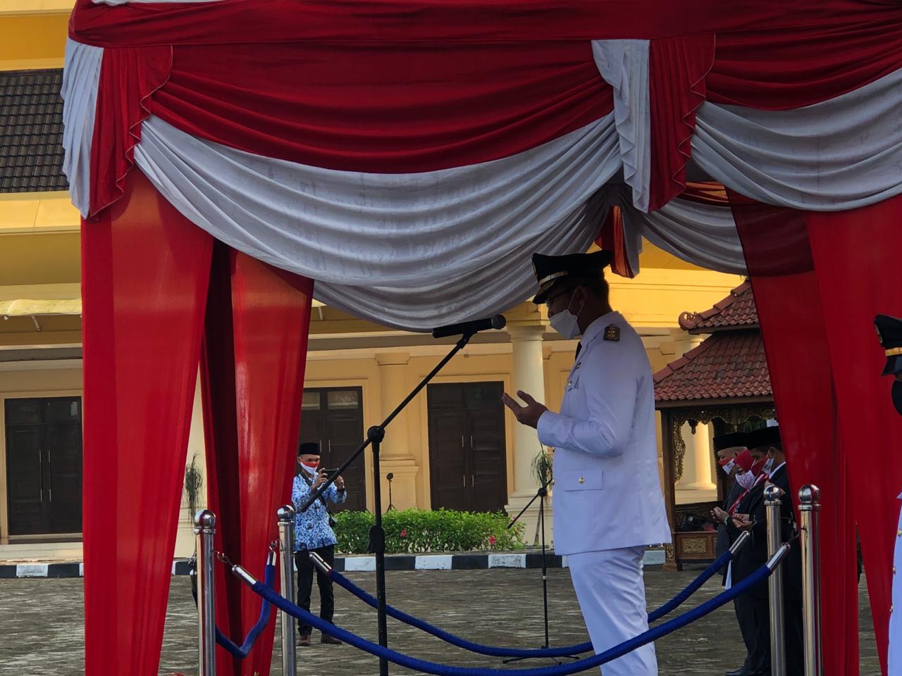 BANTEN – “Perayaan Hari Kemerdekaan Republik Indonesia yang ke-75 tahun ini kita rasakan sangat berbeda kondisinya dari tahun-tahun sebelumnya. Di mana pada saat ini, bangsa Indonesia sedang mengalami pandemi wabah covid-19,” ungkap Wakil Gubernur Banten Andika Hazrumy saat memimpin Upacara Instasional Peringatan Hari Kemerdekaan Republik Indonesia ke 75 di Lapangan Sekretariat Daerah Pemerintah Provinsi Banten, KP3B Curug,Kota Serang (Senin, 17/8/2020). Upacara Peringatan Hari Kemerdekaan Republik Indonesia ke 75 diikuti oleh Sekretaris Daerah Pemprov Banten Al Muktabar dan para Kepala Organisasi Perangkat Daerah di lingkungan Pemprov Banten. “Mari kita jadikan momentum kemerdekaan ini untuk kembali membangkitkan rasa optimisme, kebersamaan, dan solidaritas antar seluruh elemen masyarakat untuk kita bisa bersama menghadapi pandemi Covid-19 ini,” tambahnya. Ditambahkan, dengan rasa optimisme, kebersamaan, dan solidaritas, diharapkan bisa bersama-sama menekan angka penyebaran Covid-19 yang terjadi saat ini. “Khusus di Banten, dengan adanya kerjasama antara pemerintah, seluruh jajaran stakeholder, dan seluruh elemen masyarakat, daerah yang ada di Provinsi Banten kini dapat berubah menjadi zona kuning,” papar Wagub Andika. “Dari delapan(8) kabupaten/kota yang ada di Provinsi Banten hampir seluruhnya terdampak oleh pandemi Covid-19 ini. tiga (3) wilayah utama seperti Kota Tangerang, Kabupaten Tangerang, dan Kota Tangerang Selatan yang sebelumnya zona merah, kini sudah dapat ditekan angka penyebarannya sehingga dapat berubah menjadi zona kuning. Ini dapat terjadi karena dengan adanya kerjasama dan saling membahu,” tambahnya. Dalam amanatnya, Wagub Andika juga berharap kepada seluruh aparatur pemerintah di lingkungan Provinsi Banten agar dapat menjadikan momentum kemerdekaan ini sebagai waktu untuk introspeksi diri. “Mari kita sama-sama jadikan momentum kemerdekaan ini sebagai waktu untuk introspeksi diri. Bagaimana kita sebagai aparatur negara memberikan kontribusi dan pelayanan kepada masyarakat, khususnya di kondisi pandemi Covid-19 seperti sekarang ini,” ungkapnya. Dikatakan, kemerdekaan Indonesia yang dapat diraih bukan dengan cara yang mudah, melainkan dengan perjuangan dan pengorbanan baik darah, doa, serta air mata. Sebagai aparatur negara diharapakan bisa sama-sama membangkitkan rasa solidaritas, kebersamaan, serta memiliki rasa tanggung jawab. “Saya berharap agar bapak dan ibu selaku aparatur negara di Provinsi Banten dapat sama-sama meningkatkan rasa solidaritas, kebersamaan, serta yang terpenting memiliki rasa tanggung jawab untuk mengejar kembali target-target dan capaian-capaian yang sempat terhambat karena adanya pandemi ini. Saya yakin, dengan kebersamaan kita dapat kembali bangkit dan mengejar ketertinggalan untuk dapat mencapai apa-apa saja yang telah menjadi target kita khususnya untuk memberikan kontribusi kepada masyarakat Banten,” pungkasnya. Upacara ditutup dengan pembacaan doa oleh Kepala Kantor Wilayah Kementerian Agama Provinsi Banten A Bazari Syam.(***)