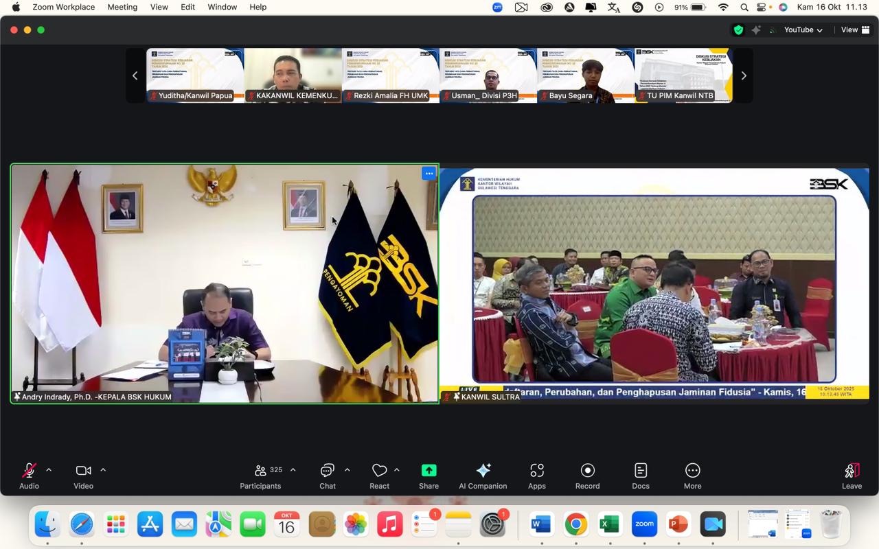 Ternate – Kepala Kantor Wilayah (Kakanwil) Kementerian Hukum (Kemenkum) Maluku Utara, Budi Argap Situngkir mengikuti kegiatan Diskusi Strategis Kebijakan (DSK) bertajuk “Evaluasi Kebijakan Permenkumham Nomor 25 Tahun 2021 tentang Tata Cara Pendaftaran, Perubahan, dan Penghapusan Jaminan Fidusia” yang diselenggarakan oleh Kanwil Kemenkum Sulawesi Tenggara secara daring, Kamis (16/10/2025).