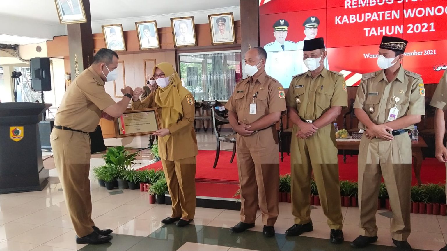Lurah dan Kepala Desa masing-masing menerima penghargaan dari Bupati Wonogiri Joko Sutopo, bertepatan dengan acara Rembug Stunting Kabupaten Wonogiri Tahun 2021, Selasa (15/11/2021).