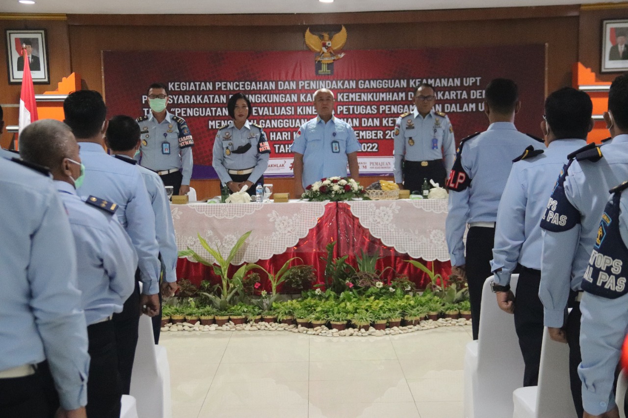JAKARTA – Satuan Operasional Kepatuhan Internal Pemasyarakatan (Satops Patnal PAS) Rumah Tahanan Negara Kelas I Cipinang ikuti kegiatan Pencegahan dan Penindakkan gangguan keamanan dan ketertiban UPT Pemasyarakatan di lingkungan Kanwil Kemenkumham DKI Jakarta dengan tema “Penguatan dan Evaluasi Kinerja Petugas Pengamanan Dalam Upaya Mencegah Gangguan Keamanan dan Ketertiban”, Kamis (17/11/2022).