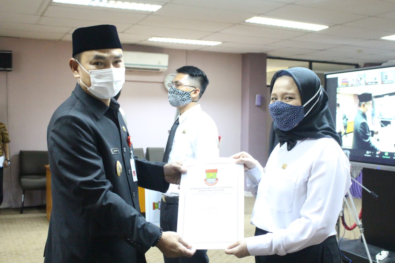 Penyerahan SK CPNS ini di lakukan secara simbolis kepada tiga orang perwakilan di ruang rapat Cituis Lantai 5 Gedung Setda Kabupaten Tangerang, diikuti oleh CPNS lainnya secara Virtual, Kamis (18/02/21)