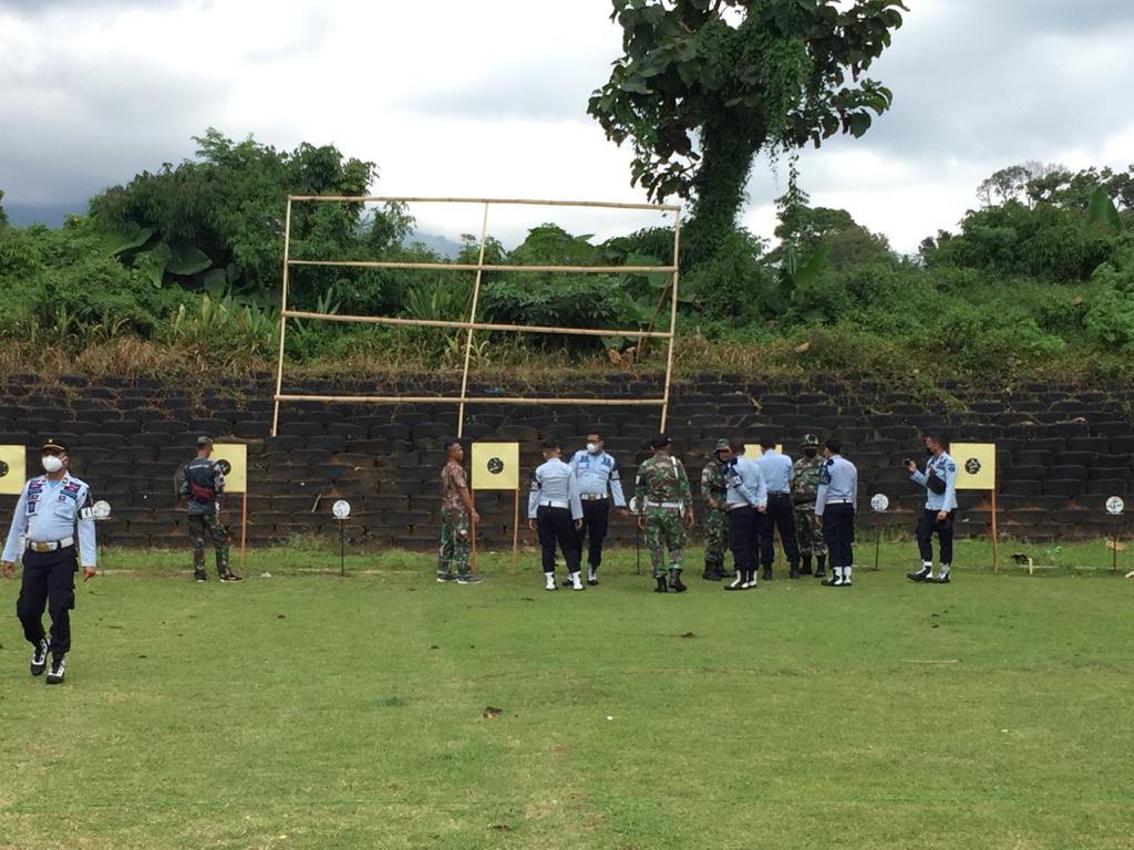 Lembaga Pemasyarakatan (Lapas) Kelas IIA Serang melakukan Latihan Menembak bersama para petugas di Batalyon Yonif 320/Badak Putih, Cadasari Kabupaten Pandeglang. Kamis (18/03/2021).