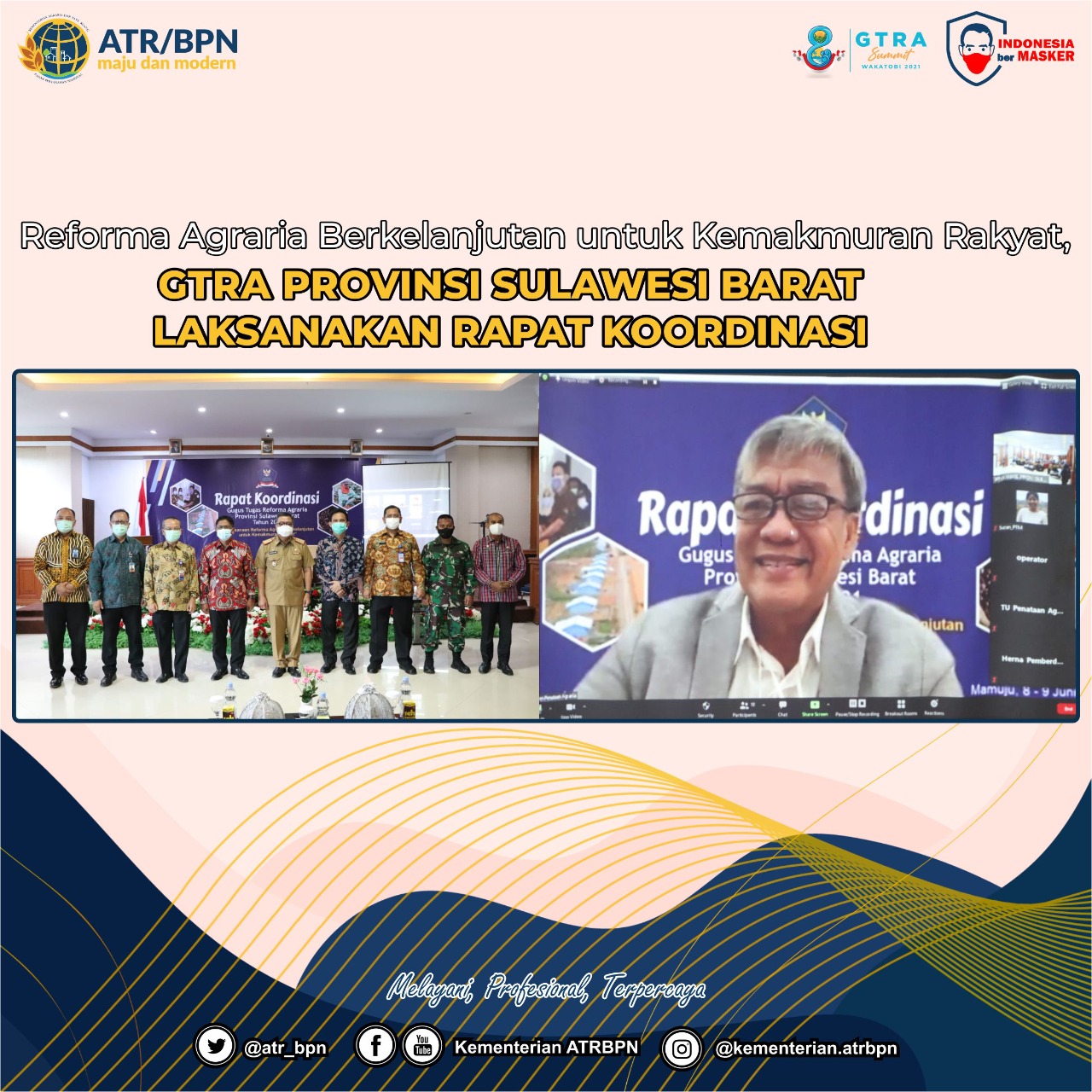 Mamuju – Kementerian Agraria dan Tata Ruang/Badan Pertanahan Nasional (ATR/BPN) melalui Kantor Wilayah BPN Provinsi Sulawesi Barat melaksanakan Rapat Koordinasi sebagai rangkaian kegiatan Gugus Tugas Reforma Agraria (GTRA) Provinsi Sulawesi Barat di Hotel Grand Mutiara, Mamuju, 8-9 Juni 2021. Rakor GTRA kali ini mengangkat tema “Pelaksanaan Reforma Agraria Berkelanjutan Untuk Kemakmuran Rakyat”.