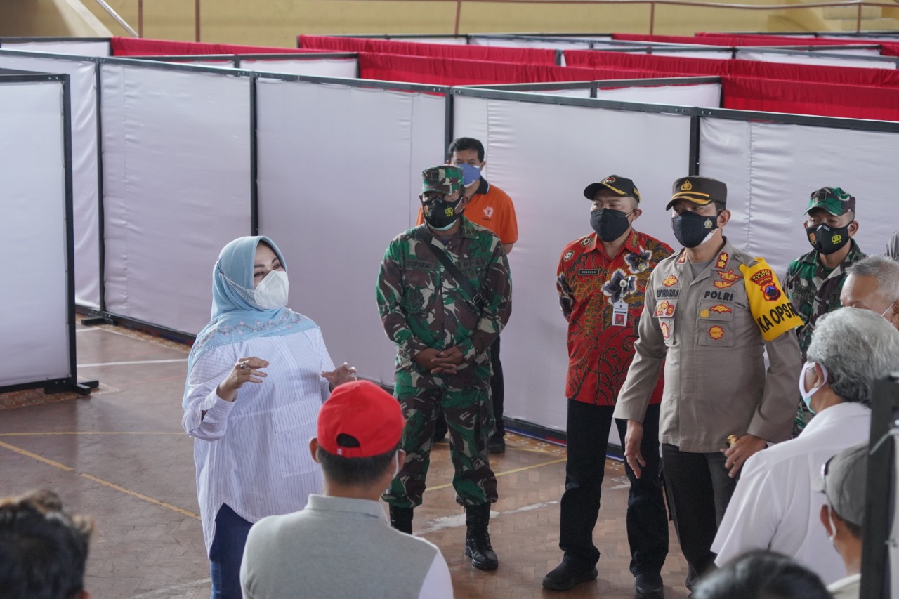 Bupati Klaten Sri Mulyani bersama Forkopimda dan sejumlah kepala organisasi perangkat daerah (OPD) melakukan pengecekan setiap sudut GOR Gelarsena, Jumat (16/7/2021). Hal itu untuk memastikan kesiapan sarana pendukung di tempat tersebut.