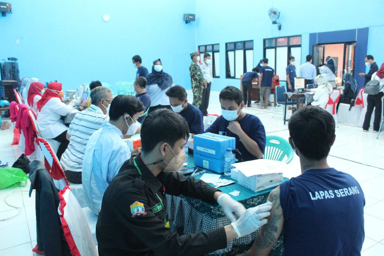 Pelaksanaan Vaksinasi bertempat di Aula Lapas Kelas IIA Serang, tampak Warga Binaan Lapas Kelas IIA Serang antusias mengikuti program vaksinasi dosis pertama tersebut guna meningkatkan kekebalan tubuh terhadap penularan virus Covid-19.