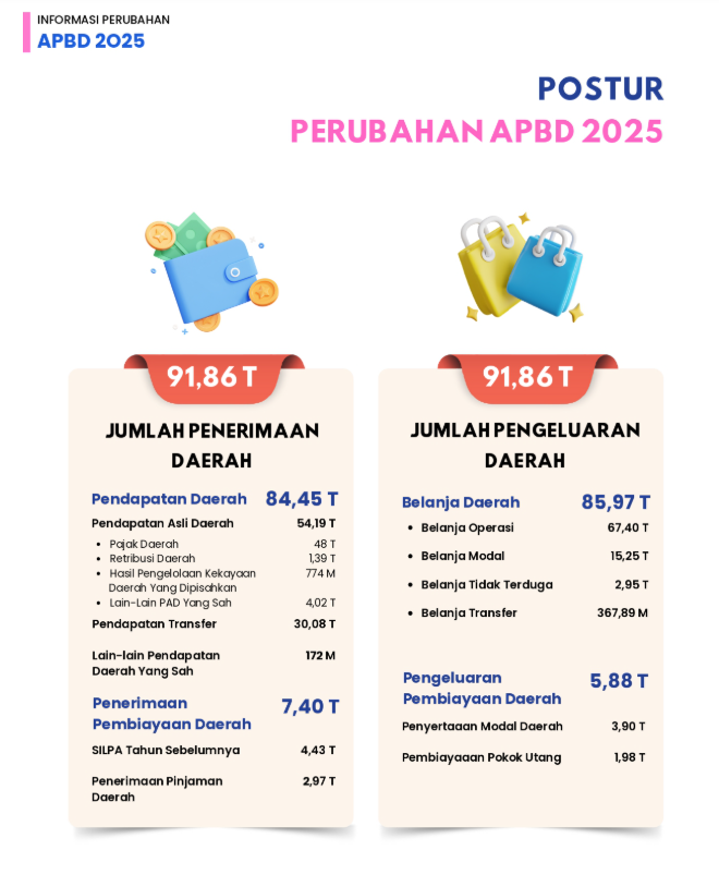 Anggaran Pendapatan dan Belanja Daerah (APBD) Tahun 2025 yang disahkan melalui Peraturan Daerah Provinsi DKI Jakarta Nomor 9 Tahun 2024 ini secara resmi menetapkan besaran anggaran bagi Pemprov DKI Jakarta sebesar Rp91,34 triliun. Selanjutnya, APBD DKI mengalami perubahan seperti yang tertera dalam Rancangan Perubahan APBD (APBDP) Tahun 2025. Nilai anggaran disepakati meningkat menjadi Rp91,86 triliun, atau naik sekitar 0,57% dibandingkan APBD murni 2025.