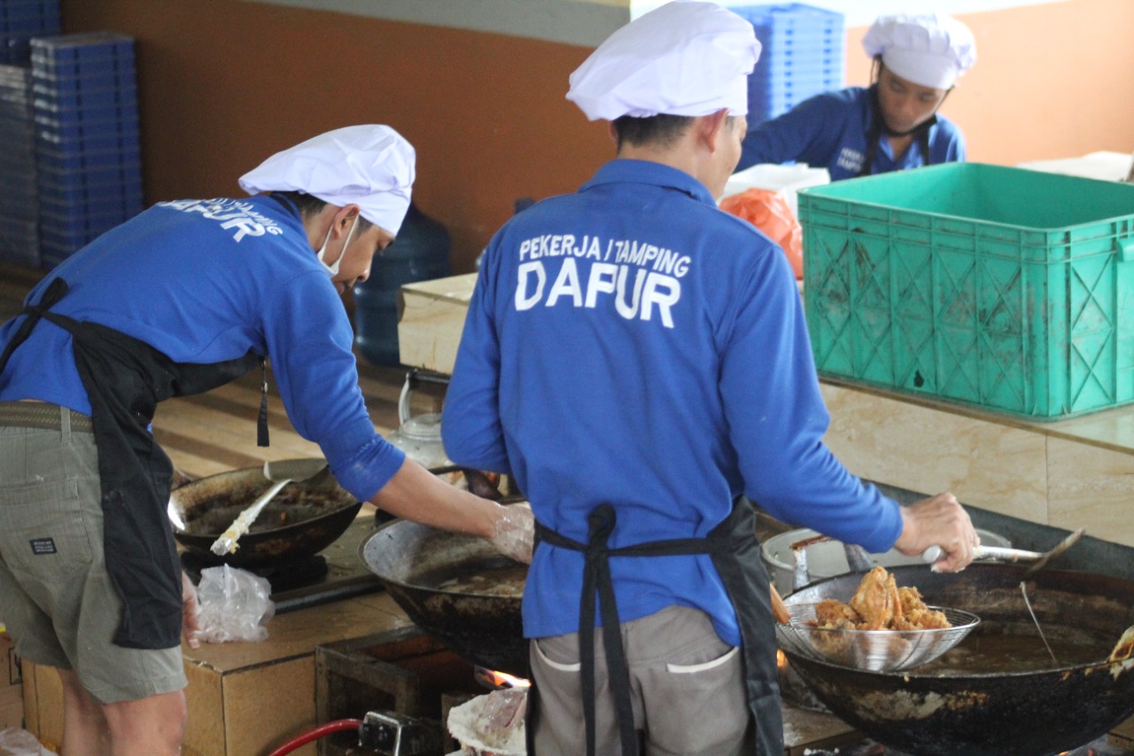 Sebanyak 1.000 (seribu) paket takjil dengan menu nasi dan ayam geprek dibuat langsung oleh para pekerja dapur Lapas Cilegon.